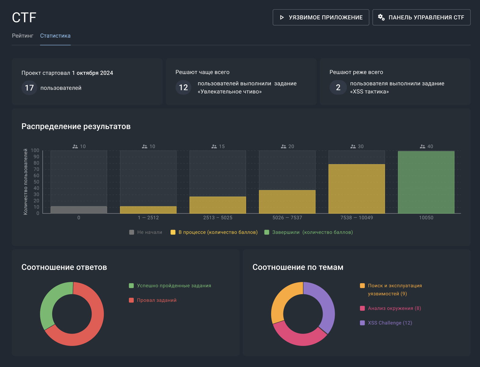 • соотношение ответов: сколько раз участники ввели неверный флаг, а сколько корректный,